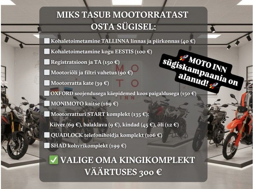 Võimalik tulla proovisõidule — demo-mootorratas ootab teid aadressil: Senasis Ukmergės kl. 4, Vilnius, Orange office hoones, MOTO INN salongis.